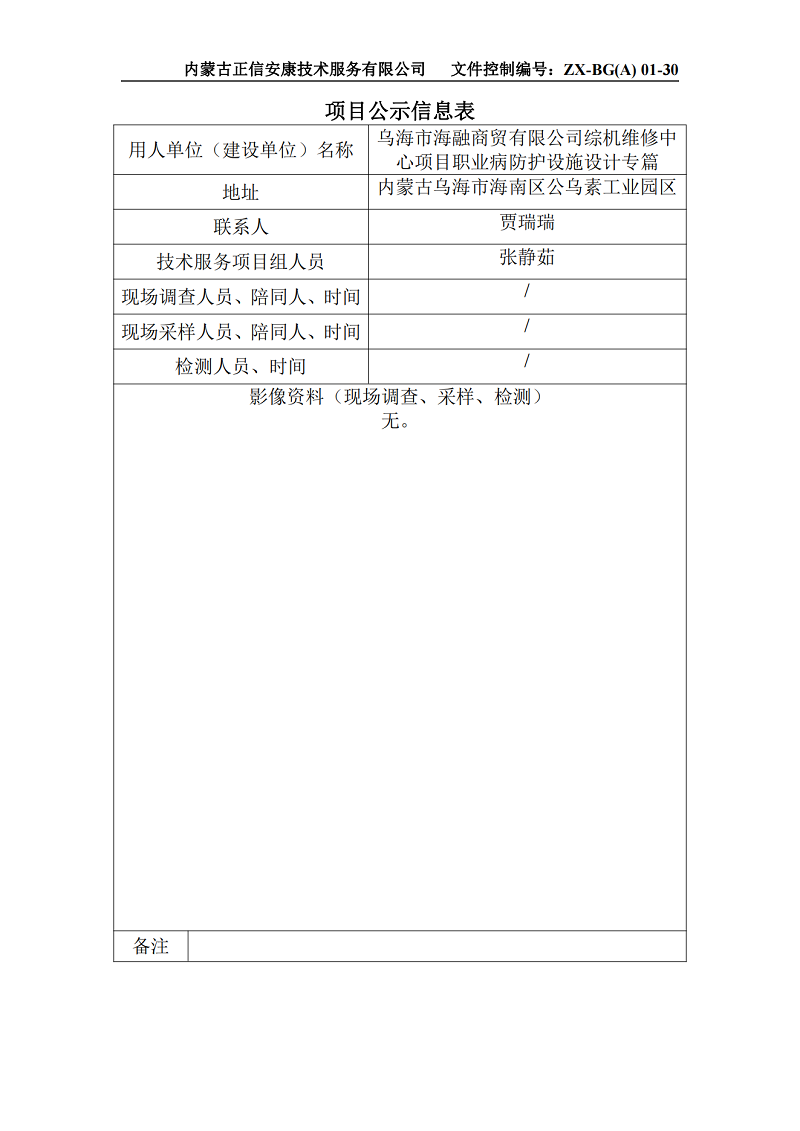 烏海市海融商貿(mào)有限公司綜機維修中心項目職業(yè)病防護設(shè)施設(shè)計專篇項目信息公示