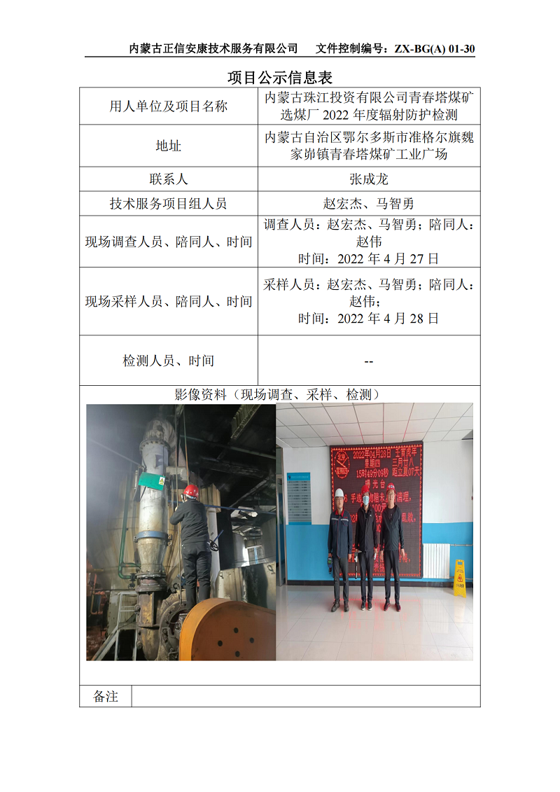 內(nèi)蒙古珠江投資有限公司青春塔煤礦選煤廠2022年度輻射防護檢測
