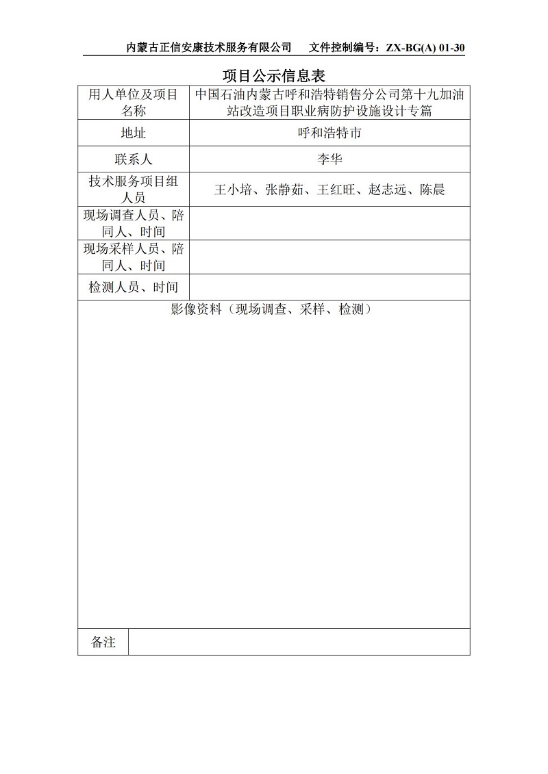 中國石油內蒙古呼和浩特銷售分公司第十九加油站改造項目職業(yè)病防護設施設計專篇公示信息表