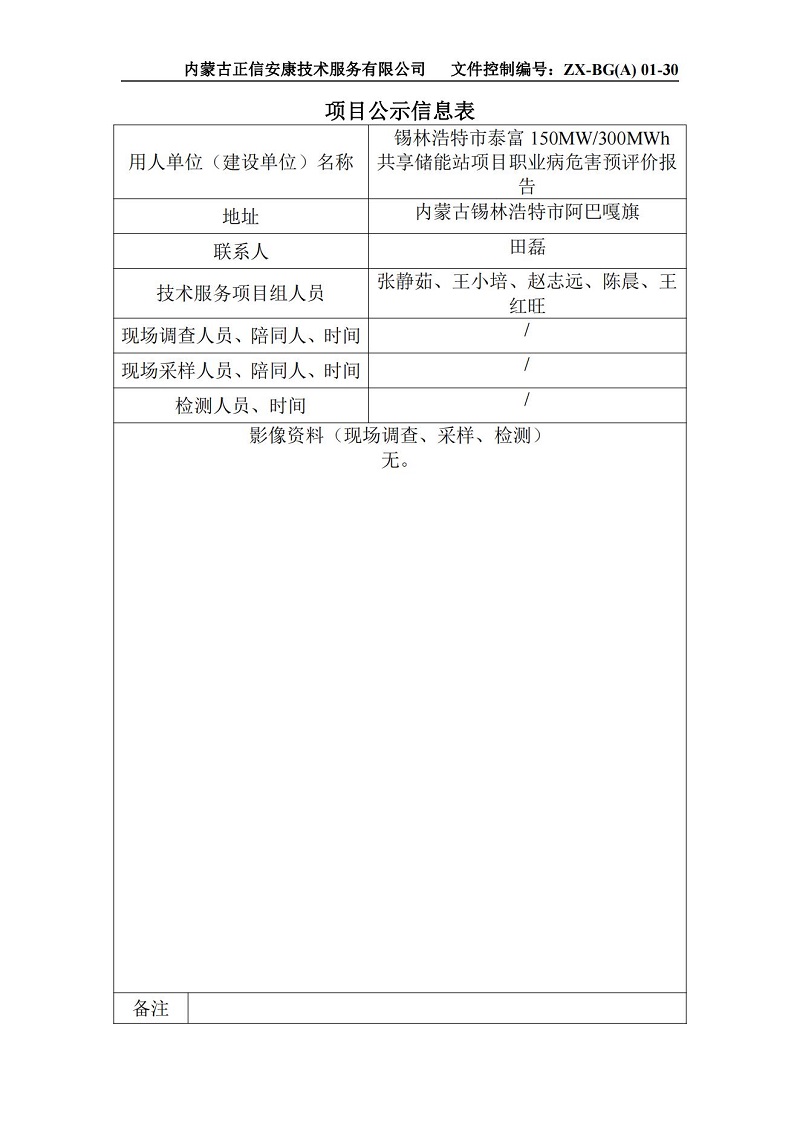錫林浩特市泰富150MW300MWh共享儲能站項(xiàng)目職業(yè)病危害預(yù)評價公示信息