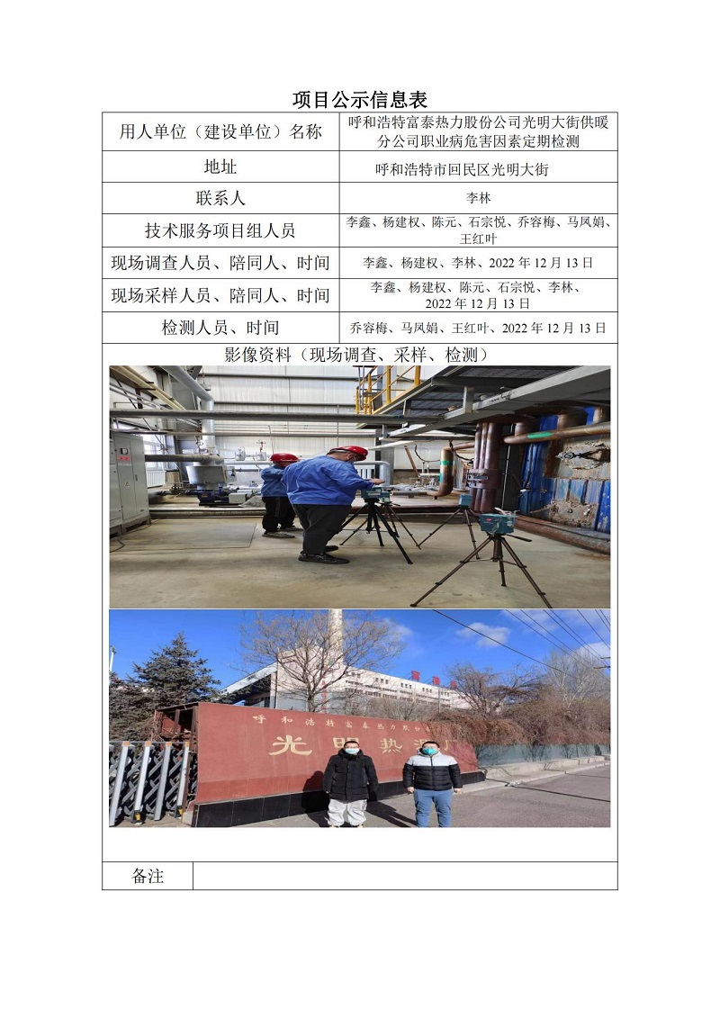 呼和浩特富泰熱力股份公司光明大街供暖分公司定期檢測(cè)