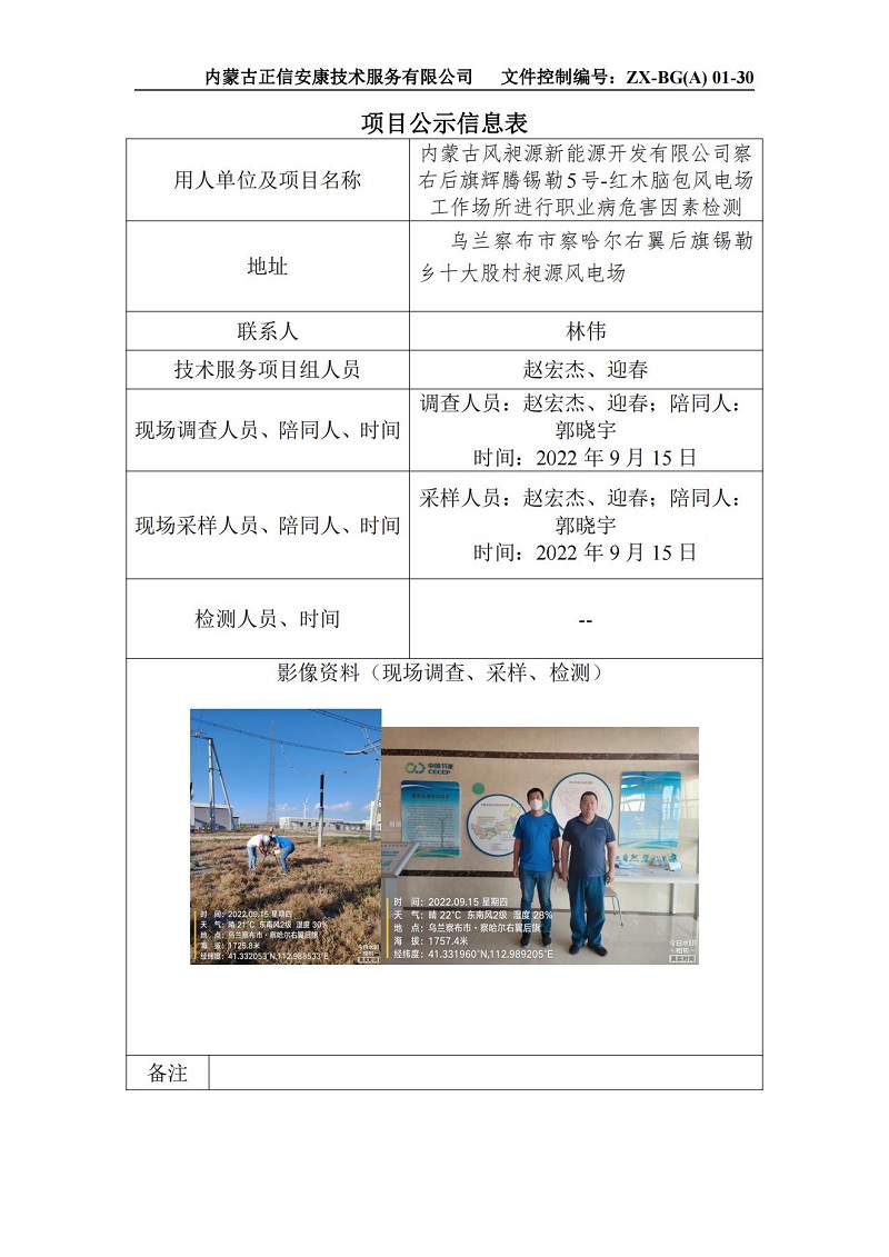 內(nèi)蒙古風昶源新能源開發(fā)有限公司察右后旗輝騰錫勒5號-紅木腦包風電場工作場所進行職業(yè)病危害因素定期檢測