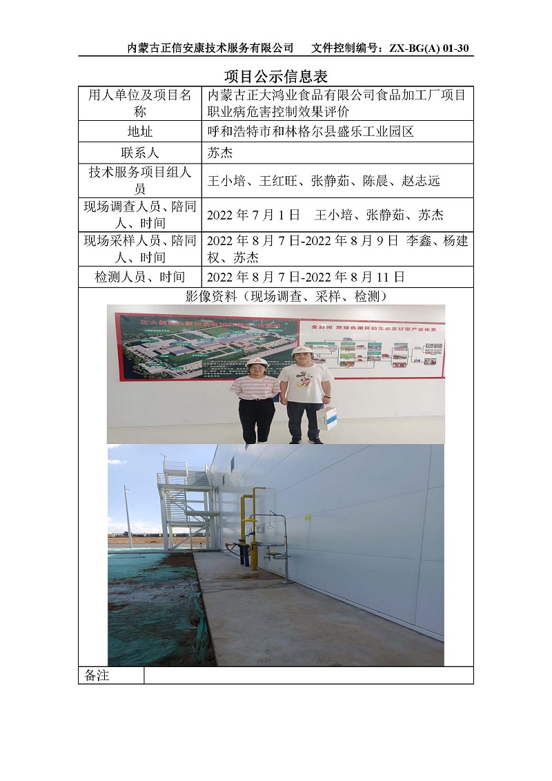 內(nèi)蒙古正大鴻業(yè)食品有限公司食品加工廠項目職業(yè)病危害控制效果評價