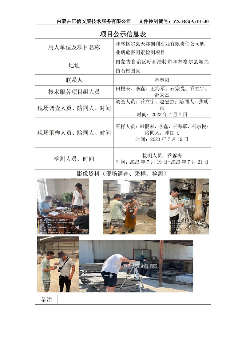 和林格爾縣天邦創(chuàng)利石業(yè)有限責任公司職業(yè)病危害因素檢測項目公示信息表