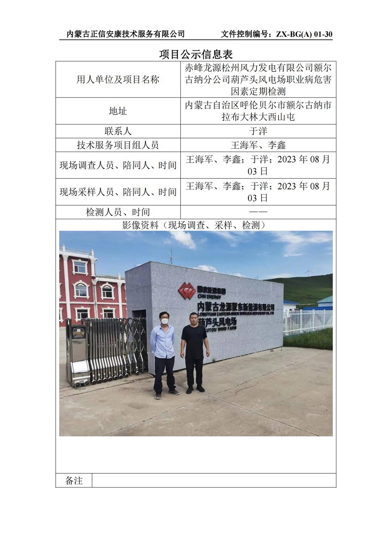 赤峰龍源松州風(fēng)力發(fā)電有限公司額爾古納分公司葫蘆頭風(fēng)電場職業(yè)病危害因素定期檢測