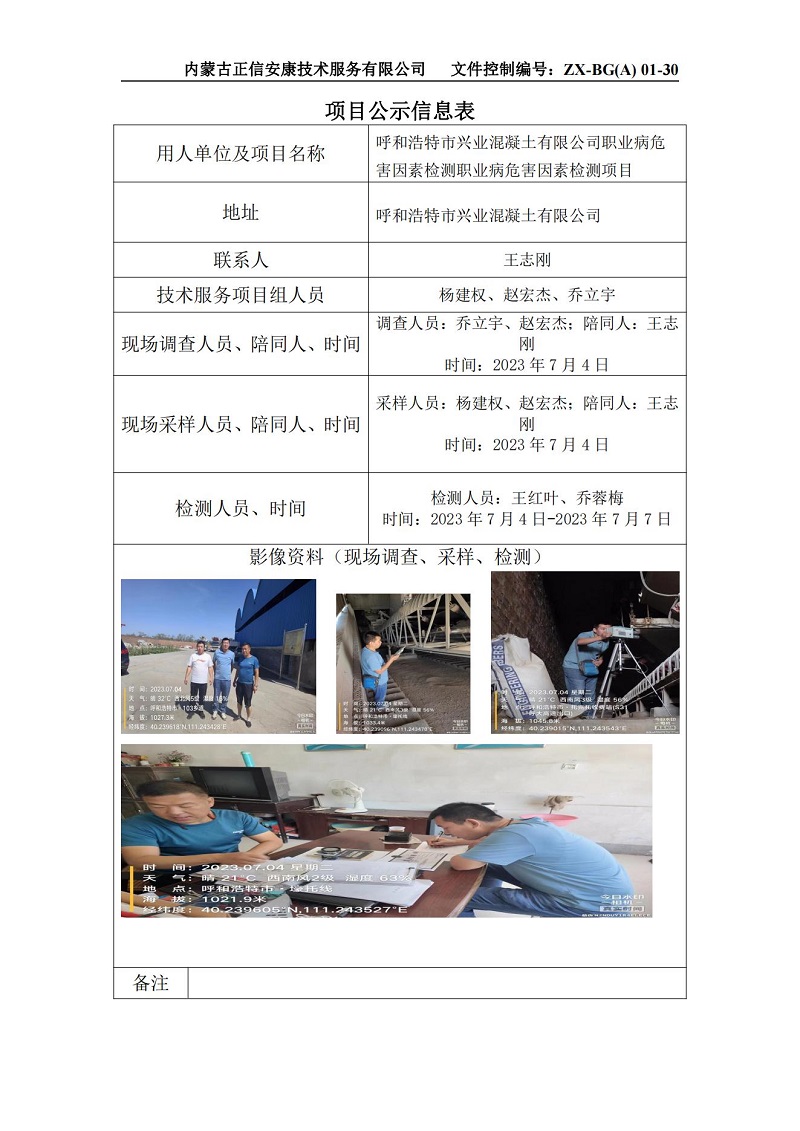 呼和浩特市興業(yè)混凝土有限公司職業(yè)病危害因素檢測 項(xiàng)目公示信息表