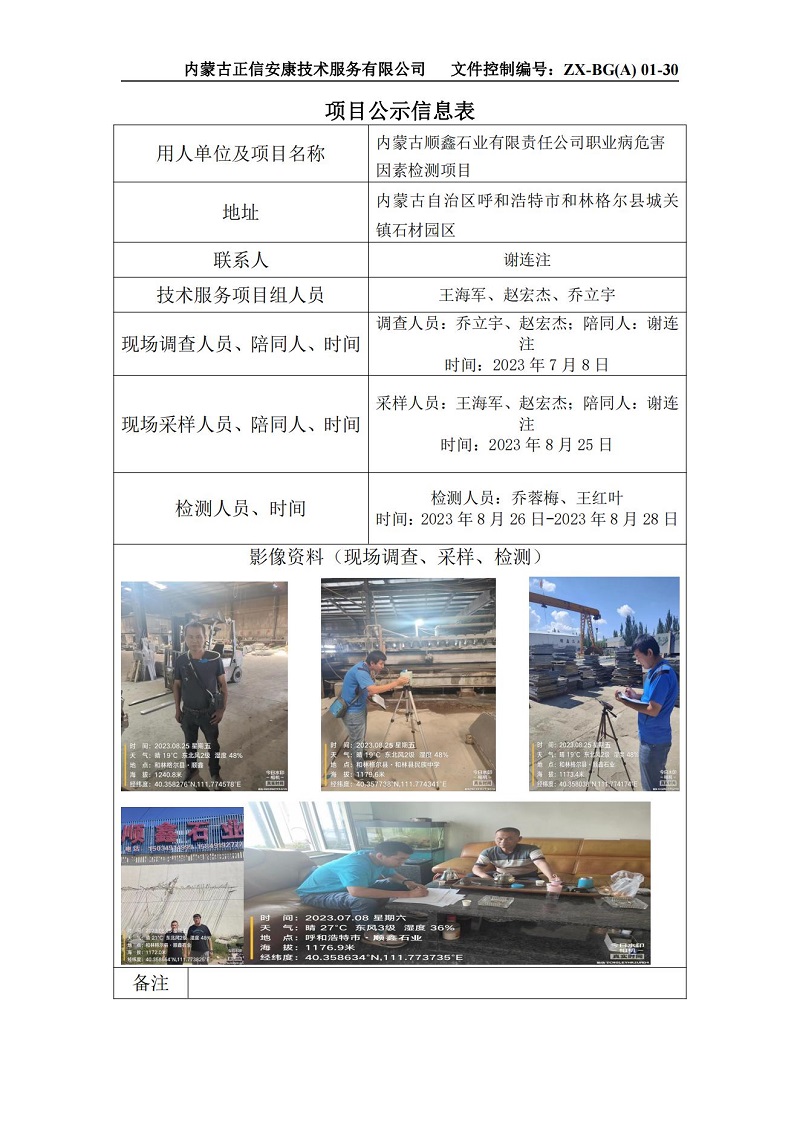 內(nèi)蒙古順鑫石業(yè)有限責(zé)任公司職業(yè)病危害因素檢測項目公示信息表