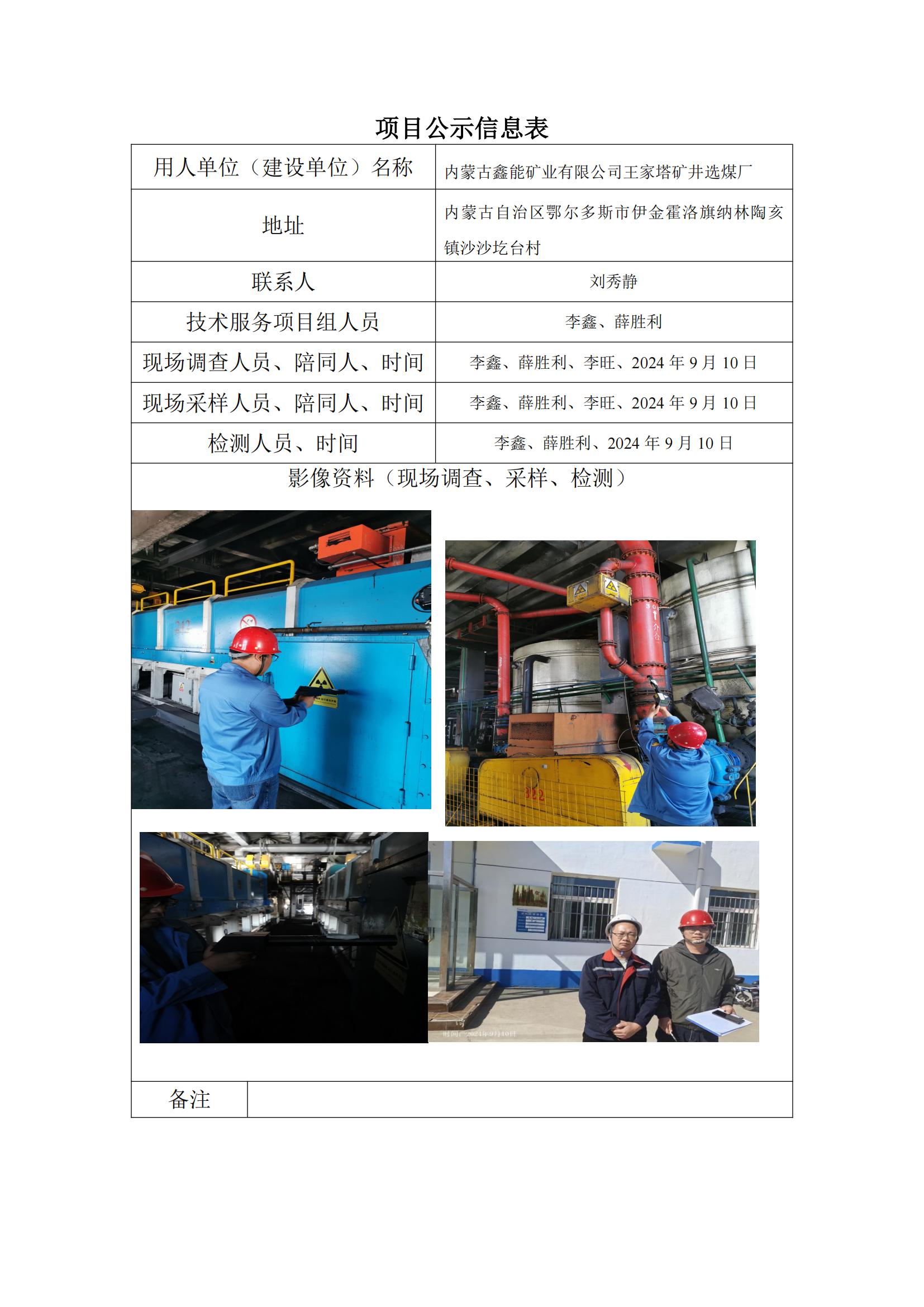 內(nèi)蒙古鑫能礦業(yè)有限公司王家塔礦井選煤廠放射衛(wèi)生防護(hù)檢測